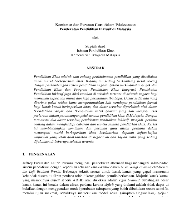 Penyelaras kecekapan guru menjalankan tugas sebagai penyelaras akan mewujudkan suasana sosioemosi yang sihat, disiplin kelas yang mantap dan keadaan bilik darjah yang kondusif dan sesuai untuk meningkatkan keberkesanan pengajaran dan pembelajaran. Pro dan kontra pendidikan inklusif. Pendidikan merupakan satu wadah utama untuk pembangunan sesebuah negara. Automatic zoom actual size page fit page width 50% 75% 100% 125% 150% 200% 300% 400%. 5 tujuan pendidikan inklusi bagi guru guru akan memperoleh kesempatan belajar dari cara mengajar dengan setting inklusi. Jabatan pendidikan khas, kementerian pelajaran. Sasaran pendidikan inklusif secara umum adalah semua peserta didik yang ada di sekolah reguler. Kajian kesapa perlunya kajian tentang komitmen dan peranan guru aliran perdana dalam pelaksanaan pendidikan inklusif di malaysia? Komitmen dan peranan guru dalam pelaksanaan pendekatan pendidikan inklusif di malaysia. Melaksanakan ppi mengikut garis panduan yang. Pendidikan merupakan suatu kebutuhan dasar bagi setiap manusia untuk dapat menjamin keberlangsungan hidup agar lebih bermartabat. Murid berkeperluan khas di aliran perdanapendekatan pendidikan inklusif adalah antara beberapa pilihan yang ada untuk kbk di malaysia. Perkataan inklusif berasal daripada bahasa inggeris v konsep pendidikan khas.