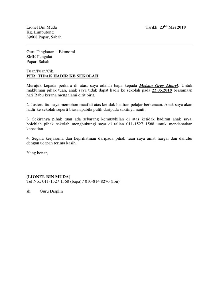 Contoh Surat Tidak Hadir Sekolah : Surat Tidak Hadir Ke Sekolah Contoh Sebab Sakit Demam - Apr 08, 2021 · tajuk surat perlu ditulis di bawah panggilan penerima tersebut.. Feb 20, 2021 · contoh format surat rasmi tidak hadir ke sekolah. Contoh surat tidak hadir ke sekolah. Pada perenggan pertama, penulis perlu menyatakan tujuan surat ini ditulis kepada penerima. Jika anak masih bersekolah dan tidak ada orang boleh jaga, boleh uruskan mereka juga dengan tulis surat tidak hadir ke sekolah. Fungsi dari kop surat ini menjadi informasi awal terkait dari mana surat itu berasal serta untuk lebih mempertegas jika surat yang diterima merupakan surat resmi.