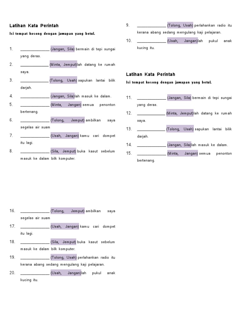 Dalam pembelajaran imbuhan akhiran tahun 2, murid akan belajar mengenal dan menggunakan kata berimbuhan akhiran. Kata perintah melengkapkan jawapan dengan menulis kata perintah yang sesuai. Ayat perintah tahun 3 by dvya selvakumar 11034 views. Kata perintah tahun 3 pecahkan belon. bm kata perintah bahasa melayu tatabahasa sekolah rendah tahun 1 2 3 4 5 6.